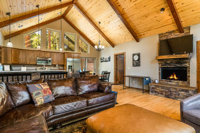 Moose Tracks Inn is a welcoming, pet-friendly home on a peaceful wooded lot in Angel Fire, New Mexico. This single-level retreat is perfect for families, offering comfort and thoughtful amenities in a convenient location just minutes from the lake, resort, and town. Walk to Monte Verde Lake or drive just a few miles to skiing, biking, golfing, and dining. After a day of mountain adventures, relax by the fire, soak in the hot tub, or enjoy the fenced deck with your dog. With space for 8 guests, Moose Tracks Inn is your cozy home base for exploring everything Angel Fire has to offer. ________________________________________ HIGHLIGHTS YOU’LL LOVE • Sleeps 8 across 2 king bedrooms + bunkroom • Single-level layout on a wooded, pet-friendly lot • Fenced yard and gated deck for kids and dogs • Hot tub + fire pit in back, gas fire pit on front deck • 3/4 mile to Monte Verde Lake, ~4 miles to resort • Roku TVs in every bedroom + gas fireplace in living room • Bike storage, wash station, and boot dryers in garage ________________________________________ ABOUT MOUNTAIN SERENITY RENTALS Part of Mountain Serenity Rentals, this home is cared for by a family-owned team with over 20 years of experience. We manage just a handful of properties, allowing us to focus on comfort, cleanliness, and service — providing essentials like firewood, propane, detergent, and kitchen basics so you can simply relax and enjoy your stay. We pride ourselves on our attentive communication and quick response times, so if you need anything during your visit, don’t hesitate to reach out — we’re always happy to help. ________________________________________ BEDROOMS & BATHROOMS Perfect for families or small groups, this home sleeps up to 8 guests comfortably. • Primary Suite: King bed, Roku TV, ensuite bathroom • Second Bedroom: King bed, Roku TV, access to shared hall bath • Bunkroom: Two twin-over-twin bunks, Roku TV — great for kids! • Bathrooms: 2 full bathrooms — one ensuite, one shared off hallway ________________________________________ LIVING & ENTERTAINMENT The open living area offers a cozy space to unwind, featuring a gas fireplace, Roku TV, and space to gather for games, puzzles, or movies. Kids can enjoy their own space in the bunkroom with a dedicated TV. ________________________________________ KITCHEN & DINING The kitchen is fully stocked with appliances, cookware, and cooking basics, including a spacious walk-in pantry for your supplies. • Main table seating for 4 • Breakfast bar seating for 4 • Outdoor picnic table for dining al fresco ________________________________________ OUTDOOR SPACES Enjoy the mountain air from two outdoor living areas: the back deck with hot tub and wood-burning fire pit, or the gated front deck with gas fire pit and picnic table. The fenced yard provides a safe space for dogs and kids to play among the pines. ________________________________________ ENTRY, LAUNDRY & PARKING Smart lock entry at the front door. Garage entry includes mudroom area with rubber mats and gear storage. • Laundry room with washer/dryer, detergent, and dryer sheets provided • Garage with space for gear or 1 vehicle • Ample parking in driveway, including space for trailers or off-road vehicles ________________________________________ EXTRA FEATURES • Pet-friendly with fenced yard and deck • Private hot tub • Gas fireplace • Bike wash station + indoor bike storage • Boot dryers • Roku TVs in all bedrooms ________________________________________ NEED MORE SPACE? We manage a small collection of hand-picked vacation homes in Angel Fire. Browse our other listings under Mountain Serenity Rentals for additional options, whether you're traveling with a larger group or looking for a different setup.